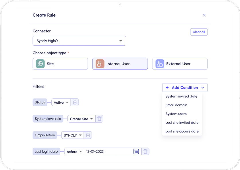 Create tailored rules with advanced filters to track precisely what matters. Syncly monitors continuously and flags anything outside your policy